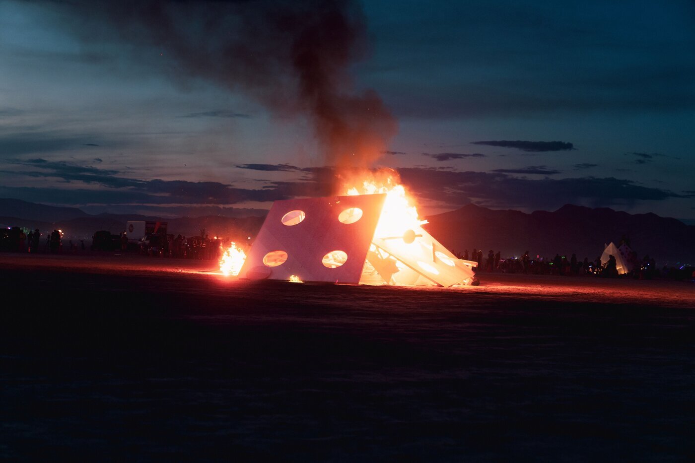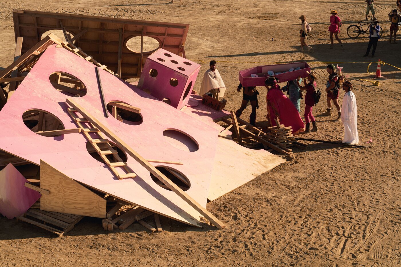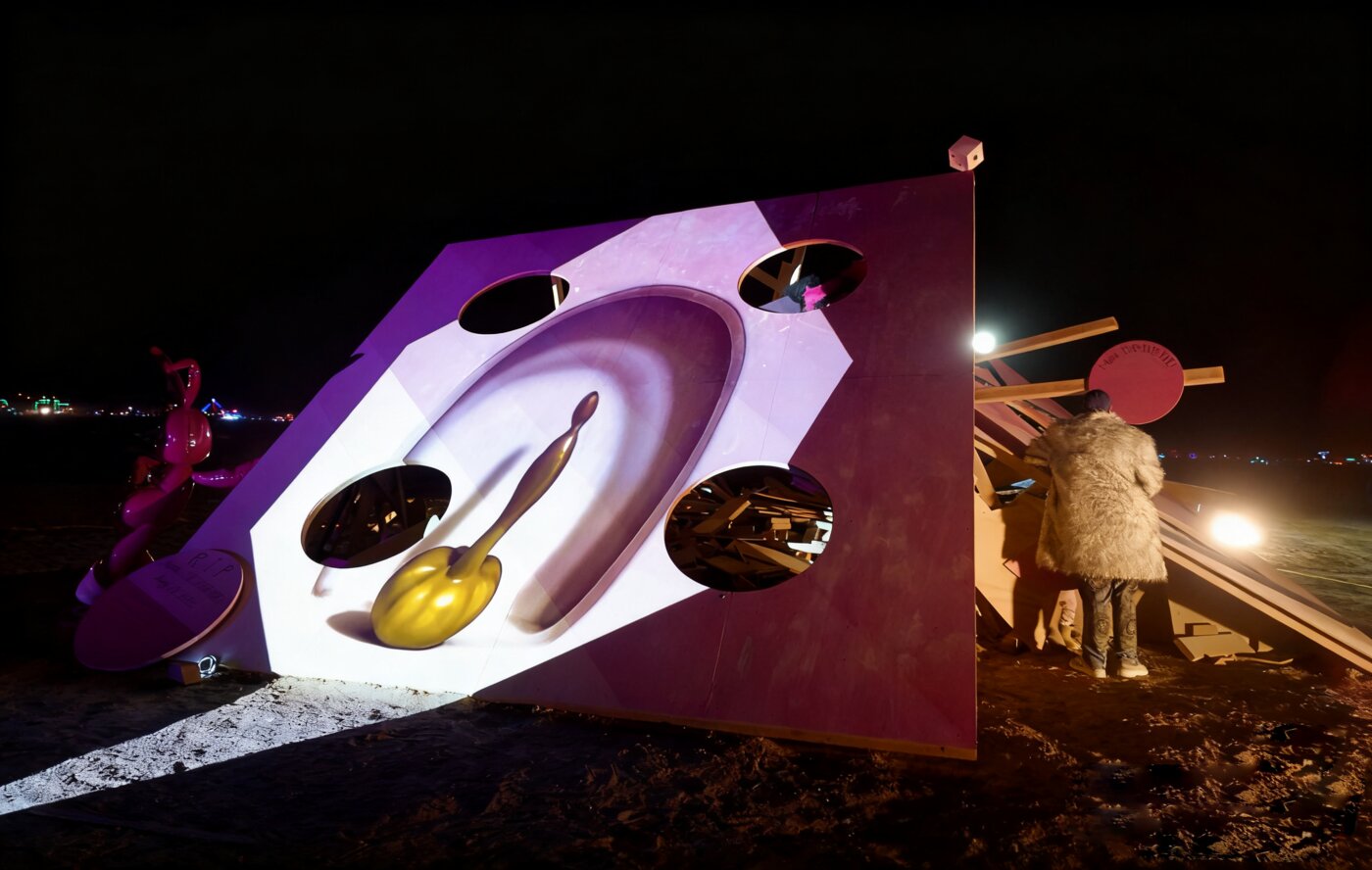 Among the hardest hit: Mona DIE! DIE! DIE!, the final piece in a trilogy by artist Miao He, following the 30-foot pink Mona Bunny and the towering Mona Mushroom. The sculpture – a giant wooden die painted in bright pink hues – was designed to explore themes of destiny and chance, chaos and impermanence, and invited participants to step into the unknown with curiosity and just “roll with it.” And this year, the playa surely did provide plenty of chaos to embrace: