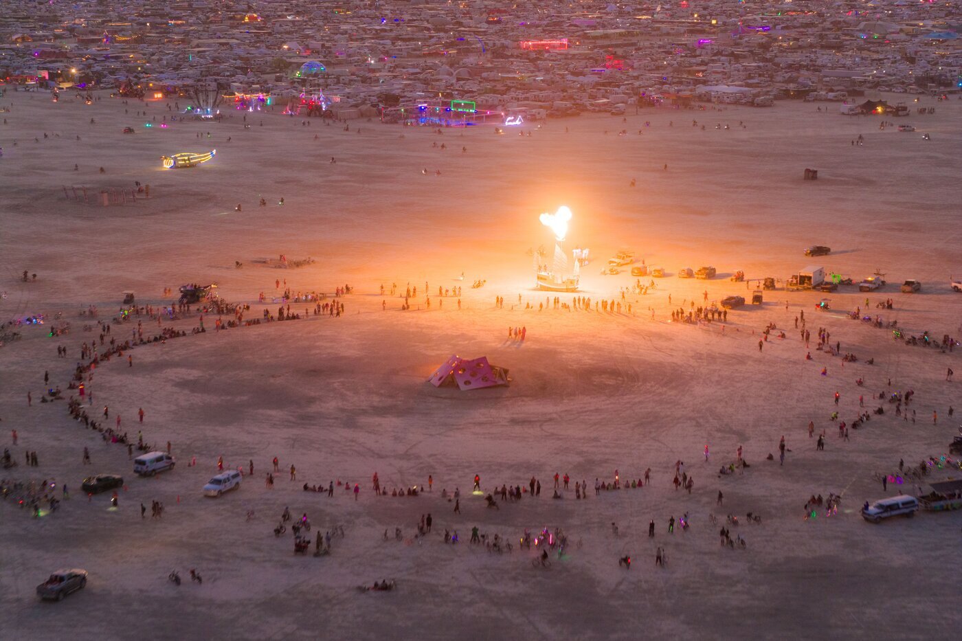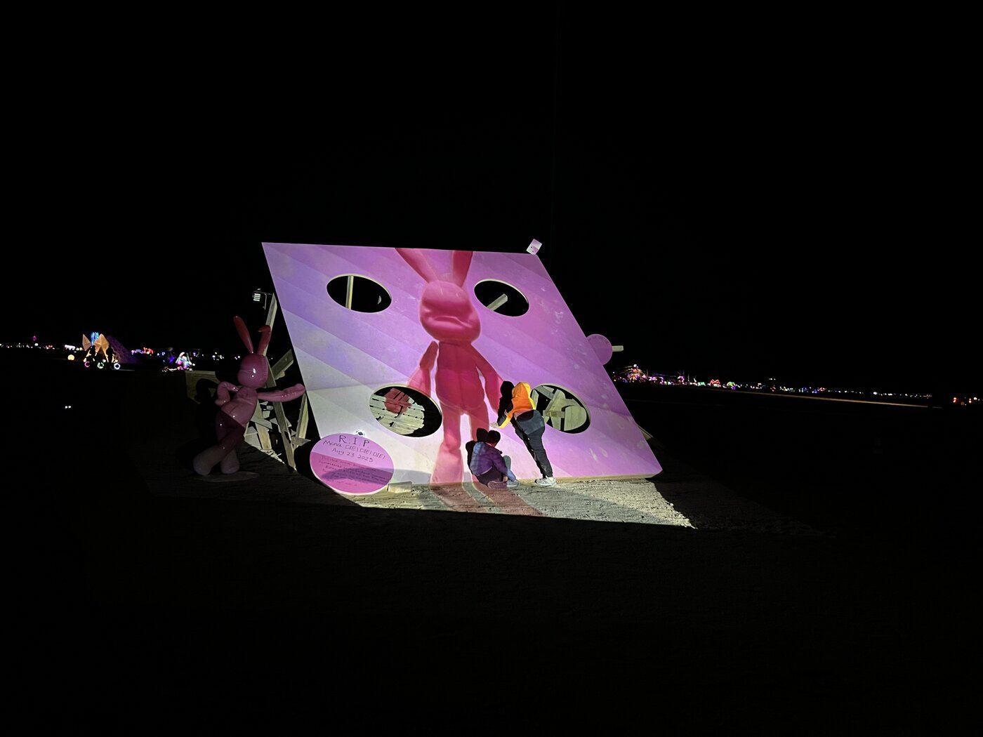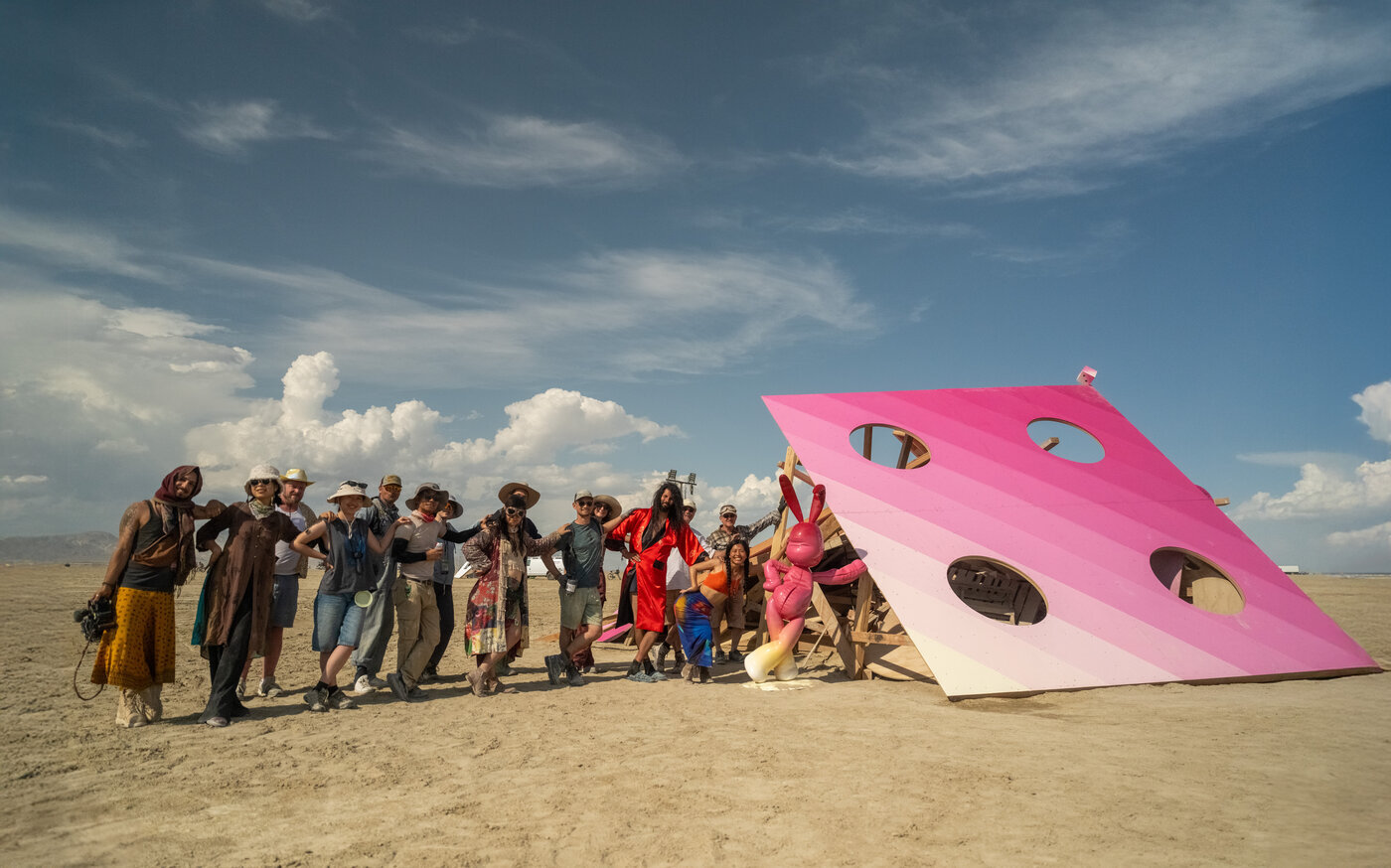 Among the hardest hit: Mona DIE! DIE! DIE!, the final piece in a trilogy by artist Miao He, following the 30-foot pink Mona Bunny and the towering Mona Mushroom. The sculpture – a giant wooden die painted in bright pink hues – was designed to explore themes of destiny and chance, chaos and impermanence, and invited participants to step into the unknown with curiosity and just “roll with it.” And this year, the playa surely did provide plenty of chaos to embrace: