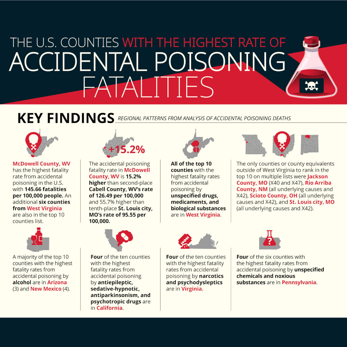 Multiple West Virginia counties rank in the top 10 of various types of accidental poisoning fatalities. Outside of West Virginia counties, the only other counties (or county equivalents) that rank in the top 10 on multiple lists were Jackson County (Missouri), Rio Arriba County (New Mexico), and St. Louis City (Missouri).