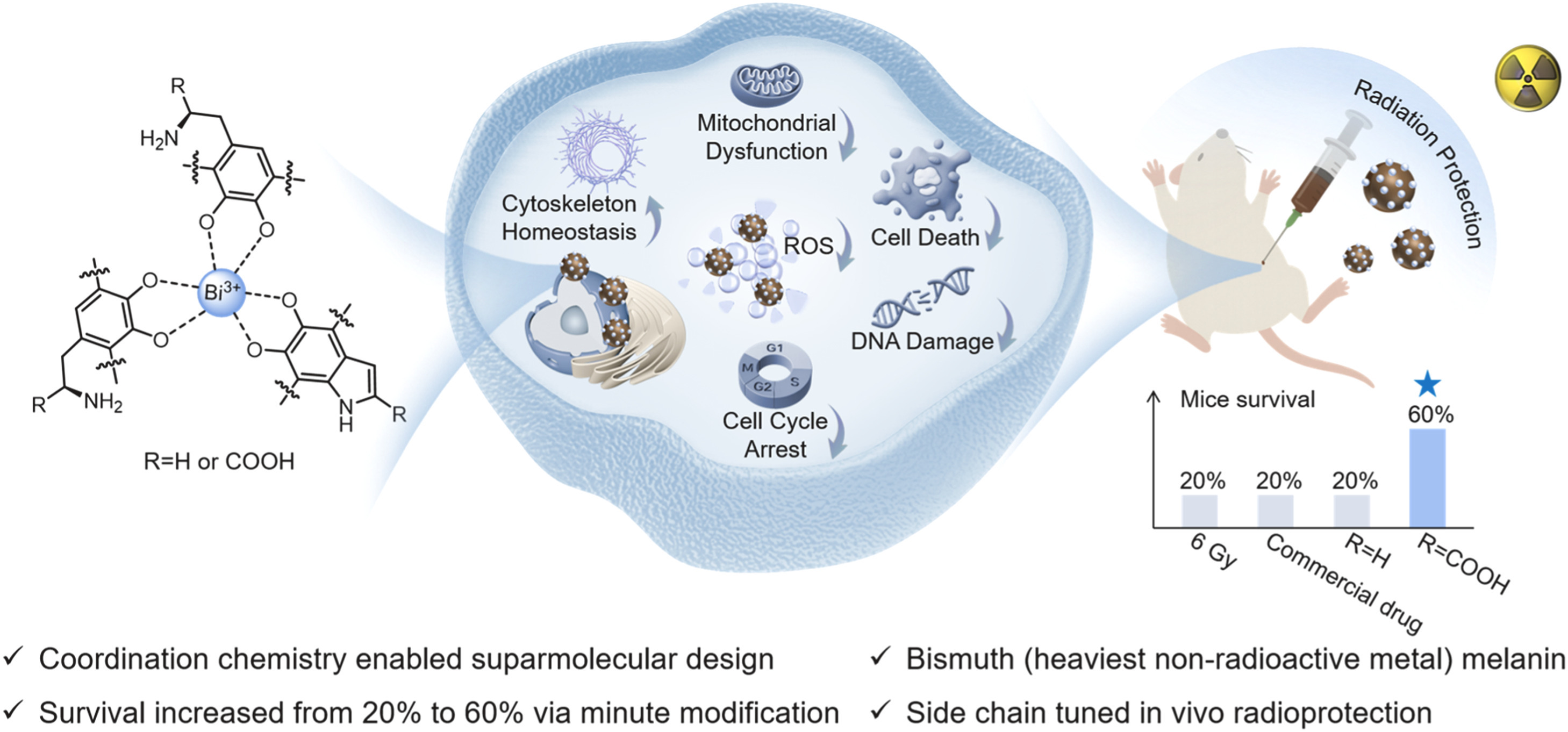 “Traditional in vivo radioprotection mostly targets oxidative stress, but we brought external high‑Z shielding into the body for the first time with a safe supramolecular strategy,” says Cao. “Bismuth is the heaviest non‑radioactive metal, and melanin is biocompatible—their coordination creates a dual‑function protector.”